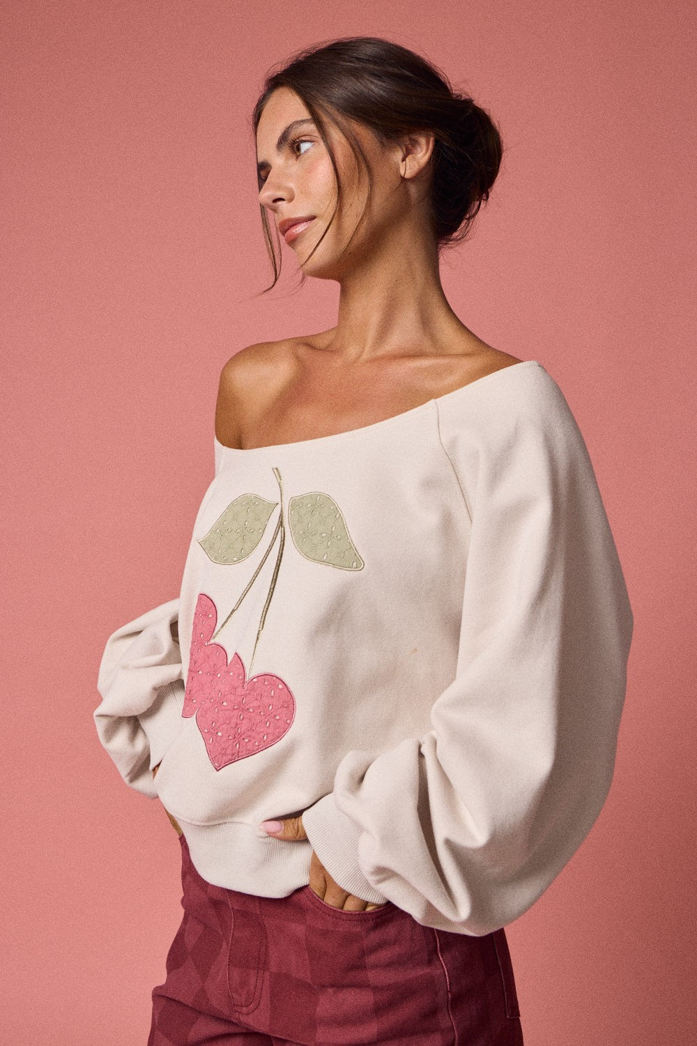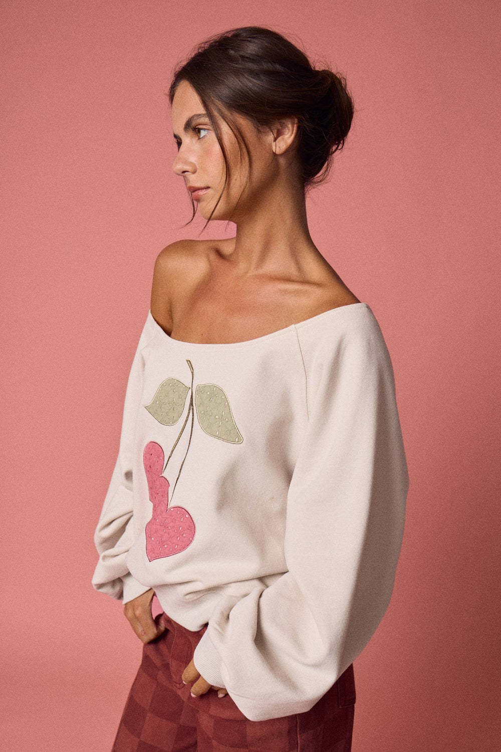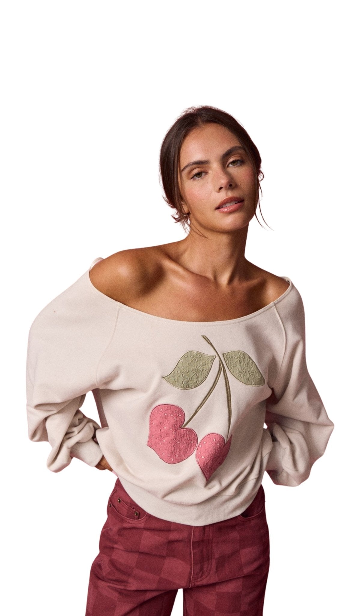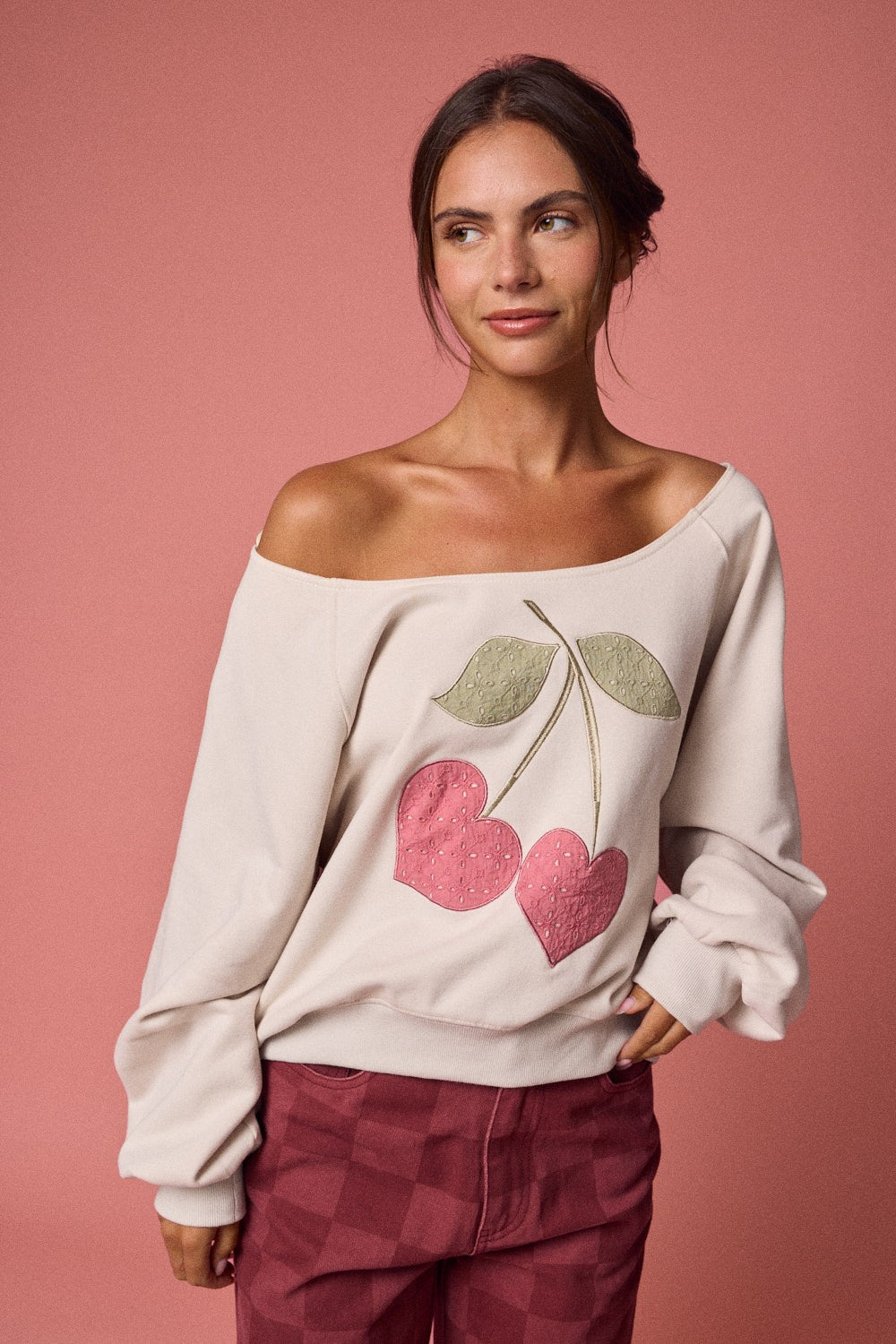 Meet your new favorite cozy-cute essential. The Cherry Darling Off-the-Shoulder Sweatshirt features a soft cream base with a sweet cherry graphic that gives effortless coquette energy in the most wearable way. Designed with a relaxed off-the-shoulder neckline and an easy, slouchy fit, this sweatshirt is made for throwing on and instantly feeling put together.
